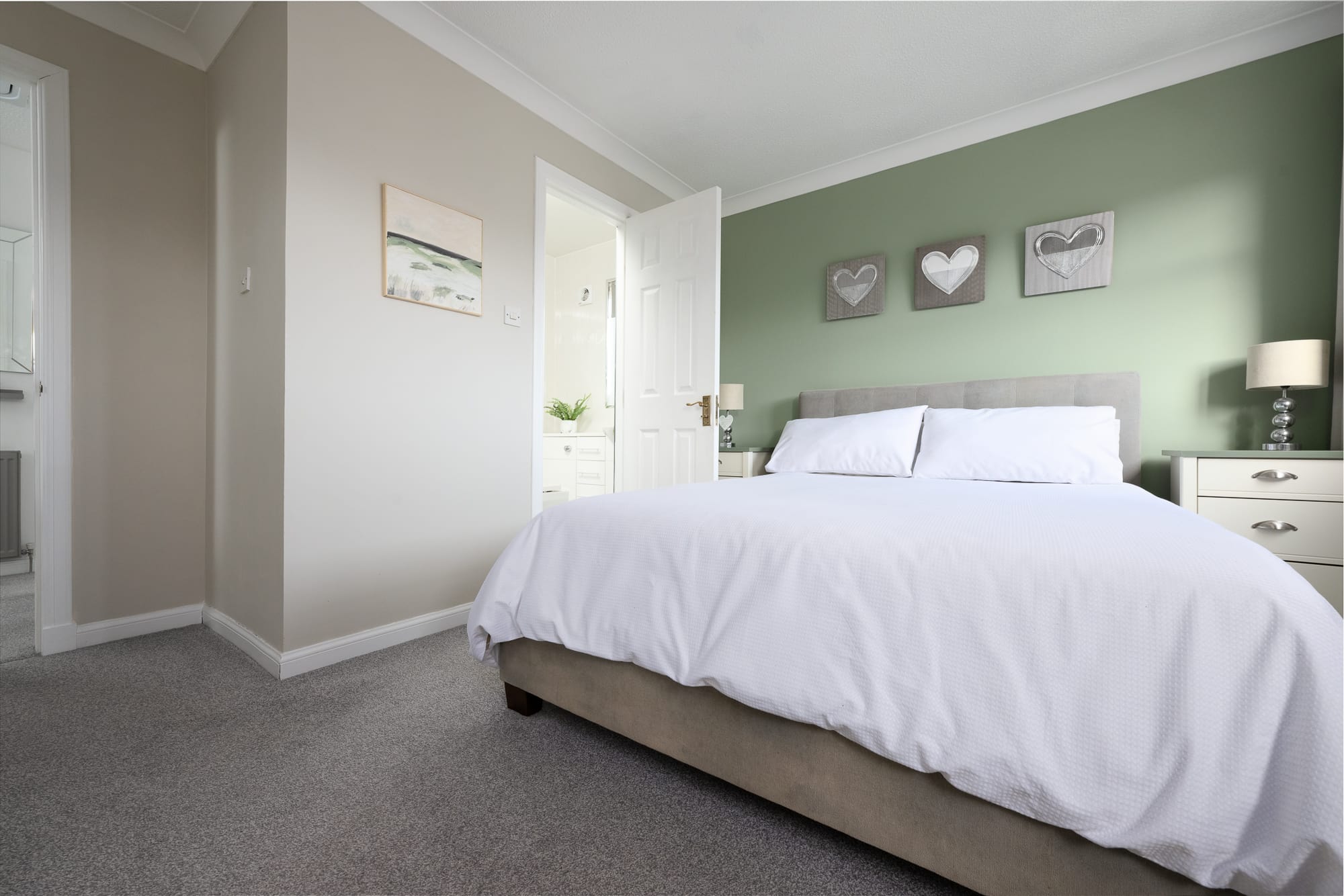 Upstairs, the master bedroom is a bright and airy space, featuring dual-aspect windows that allow for plenty of natural light. A feature wall adds warmth to the neutral décor, creating a stylish and relaxing retreat. The room benefits from built-in mirrored wardrobes, providing ample storage while enhancing the sense of space. The en-suite shower room is finished to a high standard, with a sleek vanity unit, modern tiling, and a walk-in shower. The second bedroom is well-proportioned and finished in a light, neutral palette, offering a peaceful and inviting atmosphere. A large built-in mirrored wardrobe provides excellent storage, keeping the room clutter-free. The third bedroom follows a similar aesthetic, with crisp white walls, a feature wall with subtle textured wallpaper, and a mirrored wardrobe that reflects the natural light streaming in from the large window. The fourth bedroom is currently used as a home office, offering a quiet and practical workspace with a large window overlooking the rear of the property. This versatile room can easily be adapted to suit the needs of the new owners, whether as a study, nursery, or guest bedroom. The main bathroom is sleek and contemporary, featuring a monochrome design with modern tiling and a stylish three-piece suite.